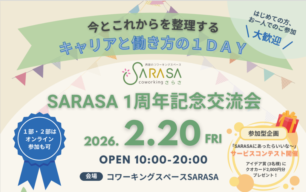 コワーキングスペースSARASA 1周年記念交流会 今とこれからを整理する|キャリアと働き方の1DAY コワーキングスペースSARASAは、 おかげさまで 1周年 を迎え... -